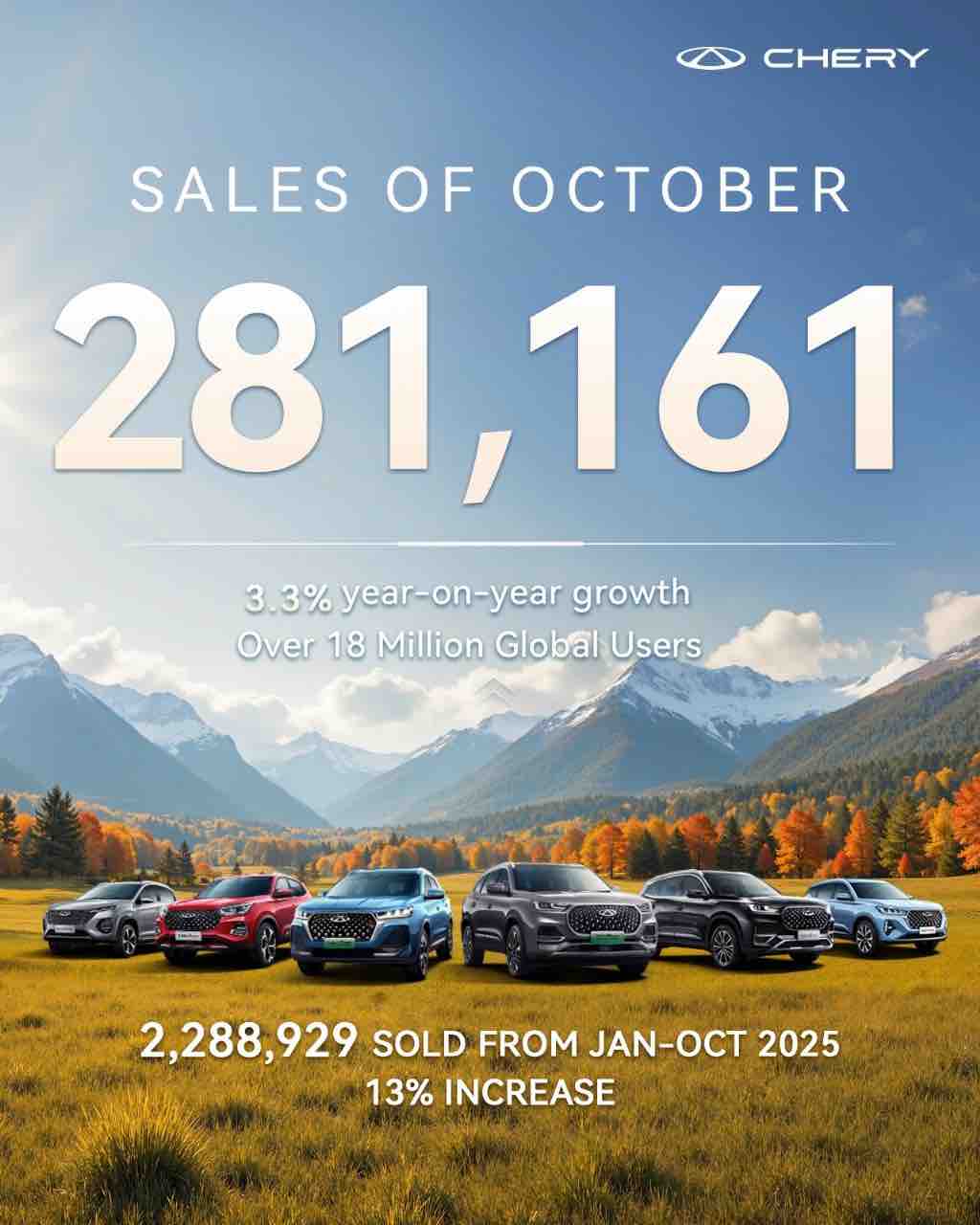 كما سجلت شركة شيري للسيارات المحدودة مبيعات بلغت 263,466 سيارة في أكتوبر بزيادة سنوية قدرها 2%. وخلال الفترة من يناير إلى أكتوبر، حققت مجموعة شيري مبيعات تراكمية بلغت 2,288,929 سيارة، بزيادة سنوية قدرها 13% محققة رقماً قياسياً جديداً للفترة. ومع تجاوز قاعدة مستخدميها العالميين 18 مليون مستخدم، منهم أكثر من 5.56 مليون خارج الصين، تدخل الشركة مرحلة جديدة من التوسع الدولي عالي الجودة.