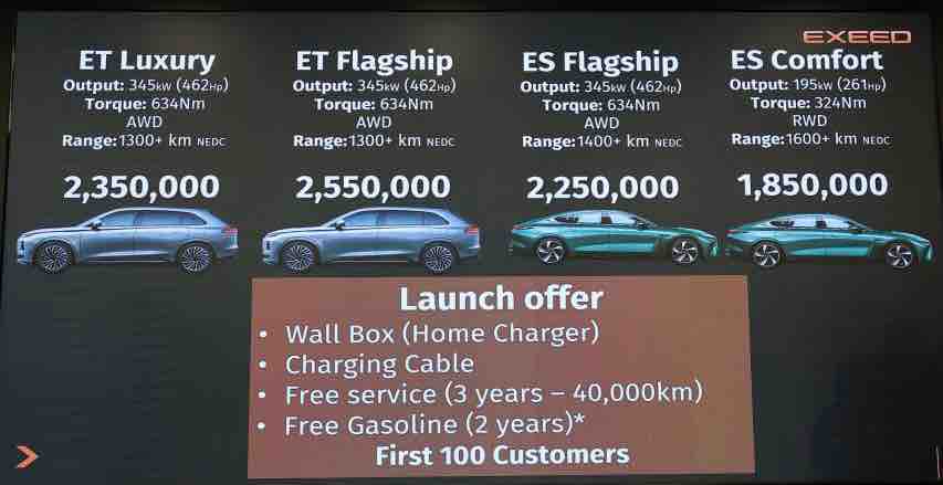 ويتميز طراز EXEED ES بمدى قيادة شامل يصل إلى 1.450 كيلومتر لموديل ES Comfort، و1.270 كيلومتر لموديل ES Flagship، مع إمكانية الشحن السريع من 20% إلى 80% خلال 17.5 دقيقة، وقدرته على التسارع من صفر إلى 100 كم/س في 4.6 ثانية. أما طراز EXEED ET فيوفر مدى قيادة يصل إلى 1,340 كيلومتر لكلا الموديلين ET Luxury، وET Flagship، ويحتاج إلى 17.5 دقيقة فقط للشحن السريع من 30% إلى 80%، بما يجعله من أكثر الطرازات كفاءة واعتمادية في فئتهما.